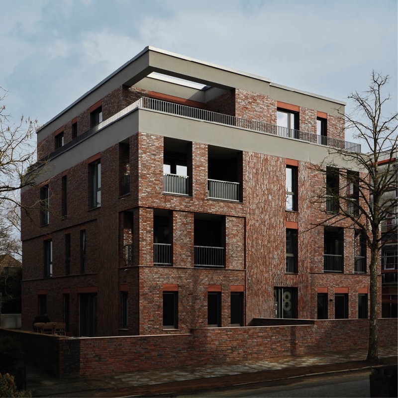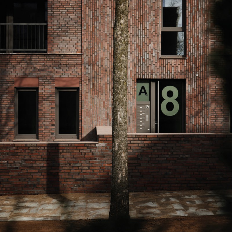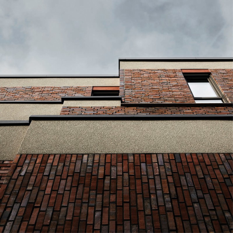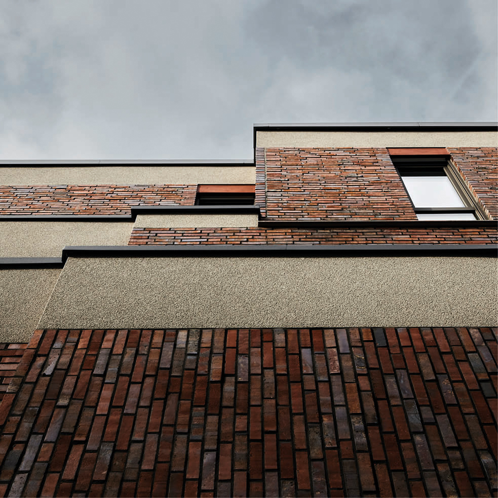 Die Fassade lebt von ihren feinen Versprüngen, die nicht nur für eine spannungsvolle Gliederung sorgen, sondern auch den Maßstab des Gebäudes angenehm aufbrechen. Das verwendete Klinkermaterial nimmt Bezug auf die lokale Bautradition und verleiht dem Neubau eine zeitlose Wertigkeit.